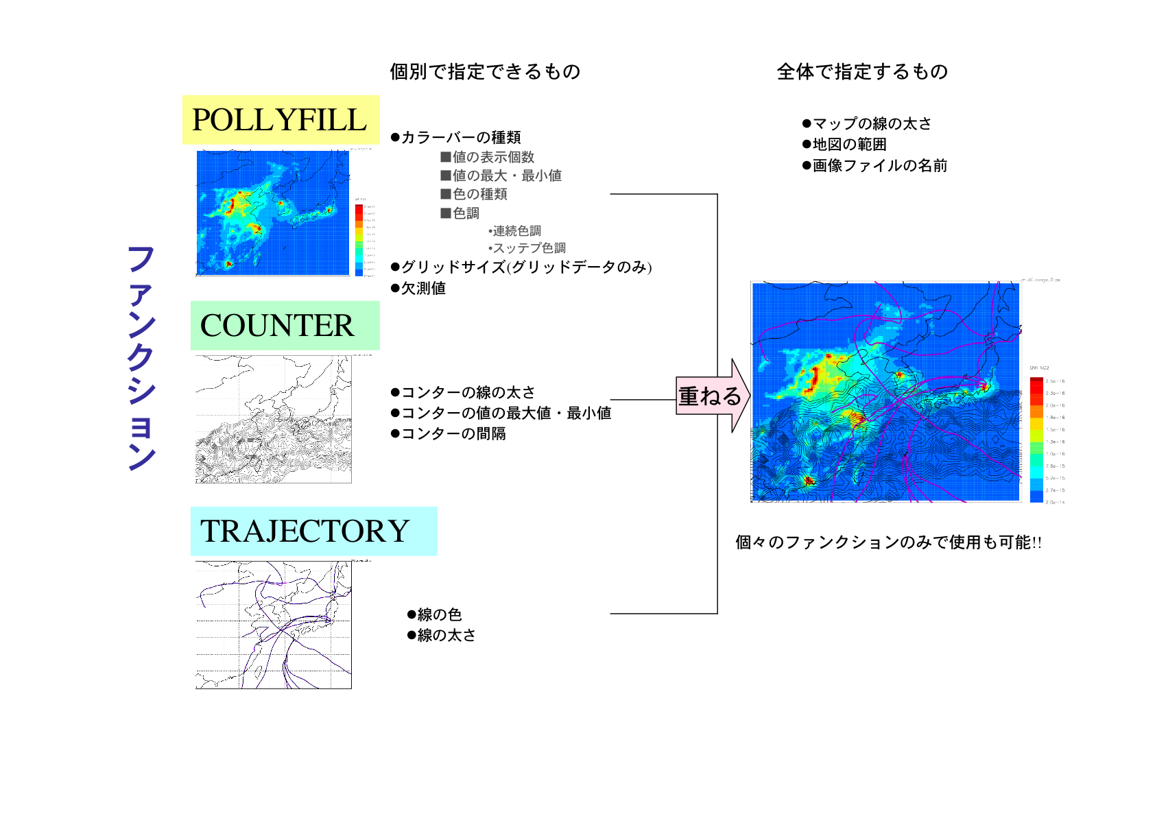 POLLYFILL、COUNTER、TRAJECTORYの3つのファンクションからなっており、それぞれのファンクションで各々のパラメータや関数がユーザーで指定できる。3つのファンクションはそれぞれで個別だけでも使用できるが、重ねて書く事も可能である。